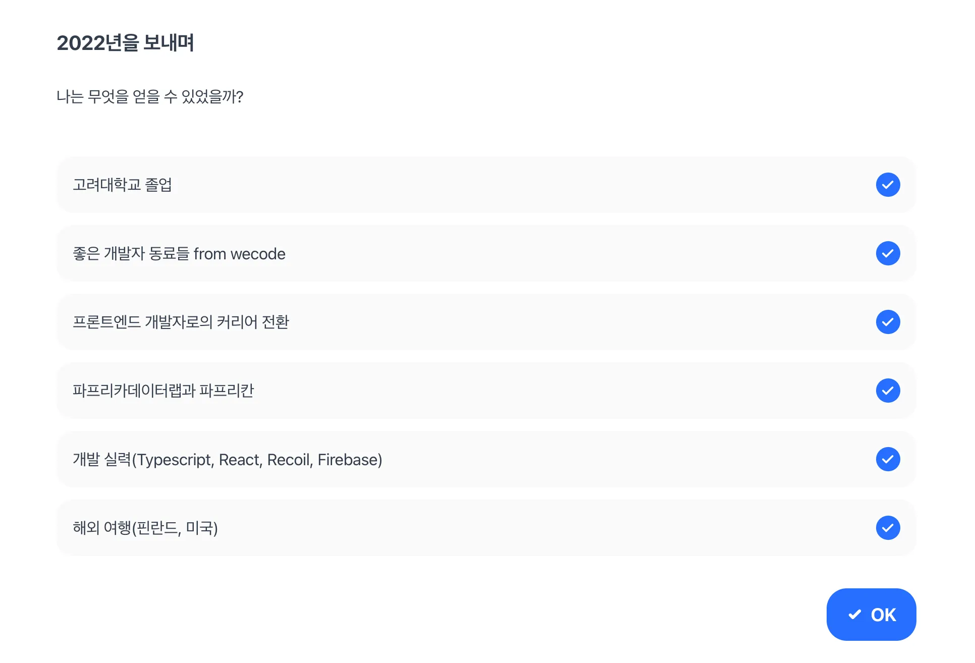 돌아보면 정말 좋은 사람들 곁에서 1년을 보낸 것 같다. 같이 프론트를 공부했던 동료분들, 나와 같이 일하는 팀원들, 가족, 친구들까지 코로나 이후로 정말 많은 사람들을 만났고 모두 좋은 사람들이라는게 나는 꽤 축복받은 사람인 것 같기도 하다.
